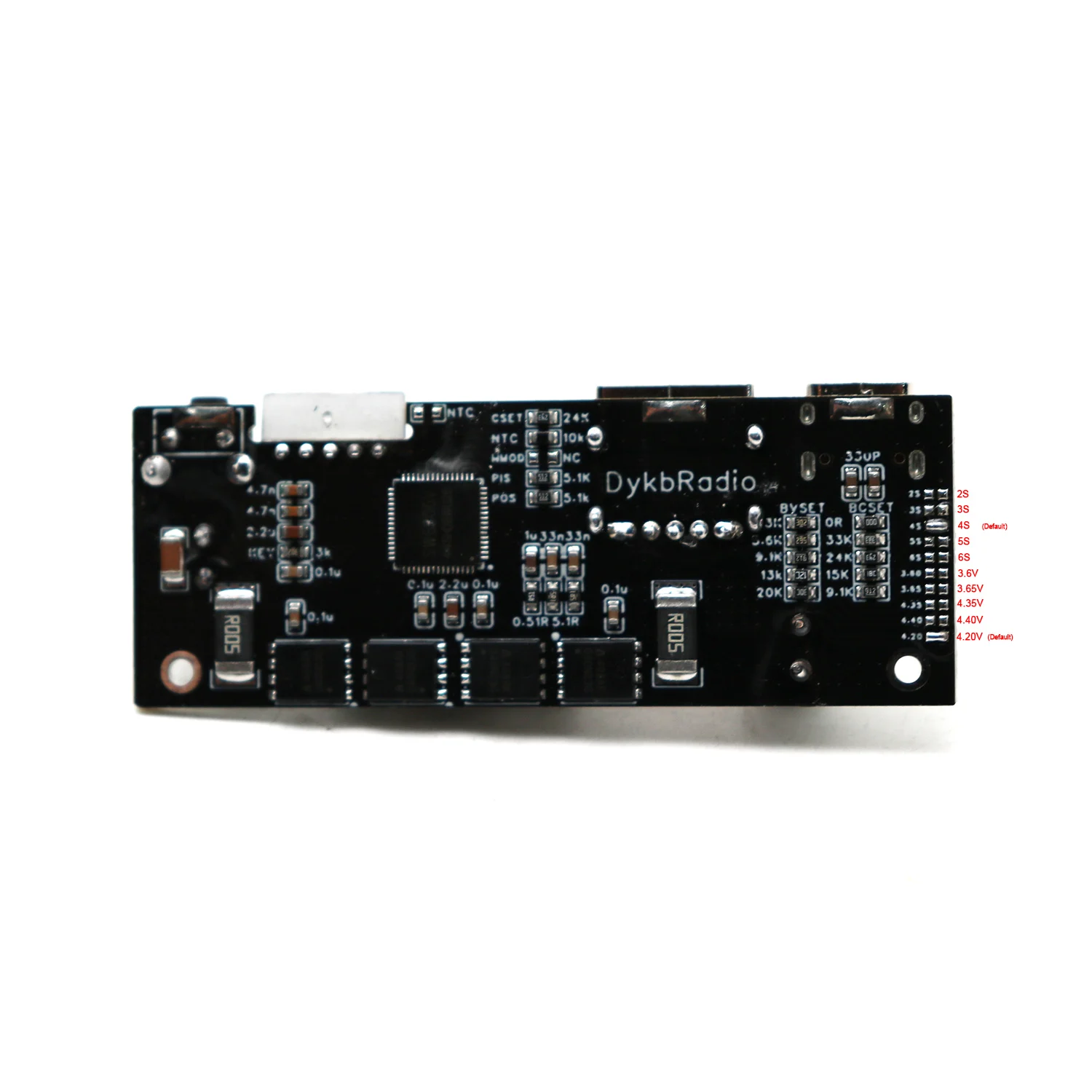 Default 4S Li-ion Supports 2S 3S 4S 5S 6S LiFePO4 (3.65V/cell) & Ternary Li-ion (4.2V/cell) (Select battery type by short-circuiting designated pads)