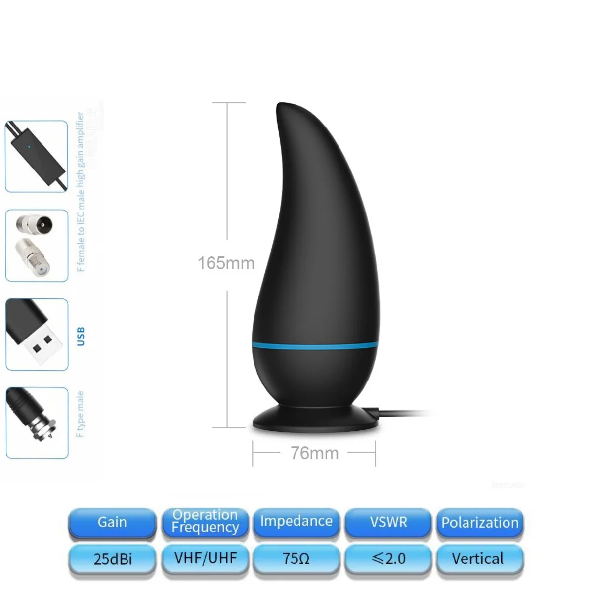 The total antenna length is 5m. make sure it's long enough to fit in a window or on a balcony, otherwise the signal might be weak or non-existent. also, please confirm there's a signal in your area before purchasing.